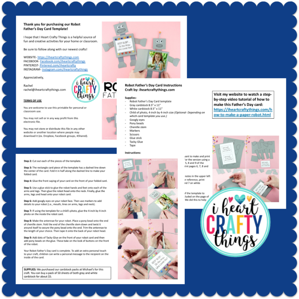 Included with the robot card template is how-to instructions and helpful tutorial photos. You can also watch a step by step video on our website of how to make the Father's Day card before or after purchasing the template.